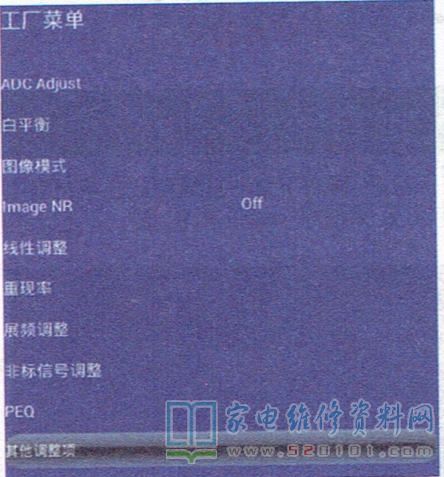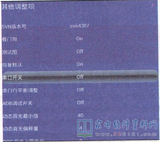 解决方法2:先进入工厂菜单,见图3,然后按一下遥控器上的菜单键,显示下一页调整项目,如图4所示,选择“其他调整项”后按确认键,出现如图5所示项目,将“串口开关”和“串口白平衡”都设为"Off" ,然后关机后重新上电即可。