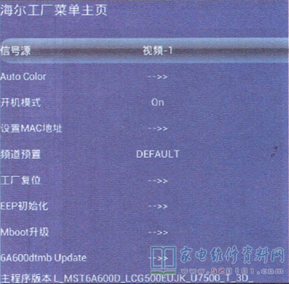 海信LE55A390P( 6A600机芯)液晶电视开机后,屏右下角一直显示红色字符“F”,如图1所示。解决方法1:按遥控器上的菜单键及数字键8、8、9、3进入工厂菜单,选择“工厂复位”一项,如图2所示。