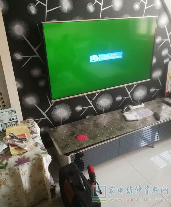接修一台海信LED55K370电视,故障表现是开机后无图像,用户到店里面要求上门配遥控器,说是海信液晶电视开机后蓝屏遥控不能用没有图像。带遥控到地方开机看显示完海信电视开机画面后屏幕为暗蓝色无字符,遥控和按键皆无反应。电视坏和遥控没关系,报价先升级试看如果不行换板,同意后拍照型号回店下载软件(