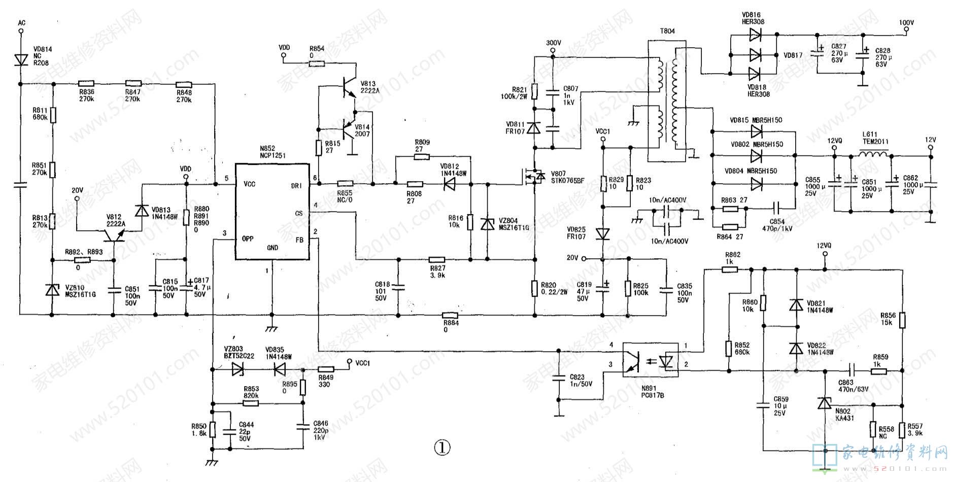保护电路:N852(NCP1251)本身自带了多种保护。另外,在开关变压器T804引出一个绕组,与R849、VD835、VZ803等元件组成过压保护电路。当输出电压异常升高时,这个绕组的电压也会升高,经过VD835整流,当该电压超过22V时就会击穿VZ803,致使N852的③脚( OPP/OVR )电压超过3V,N852立刻锁定,电路停振,直到排除故障。N852的④脚( CS )脚通过对电阻R820上的压降进行监控,起到一个电流检测保护功能。