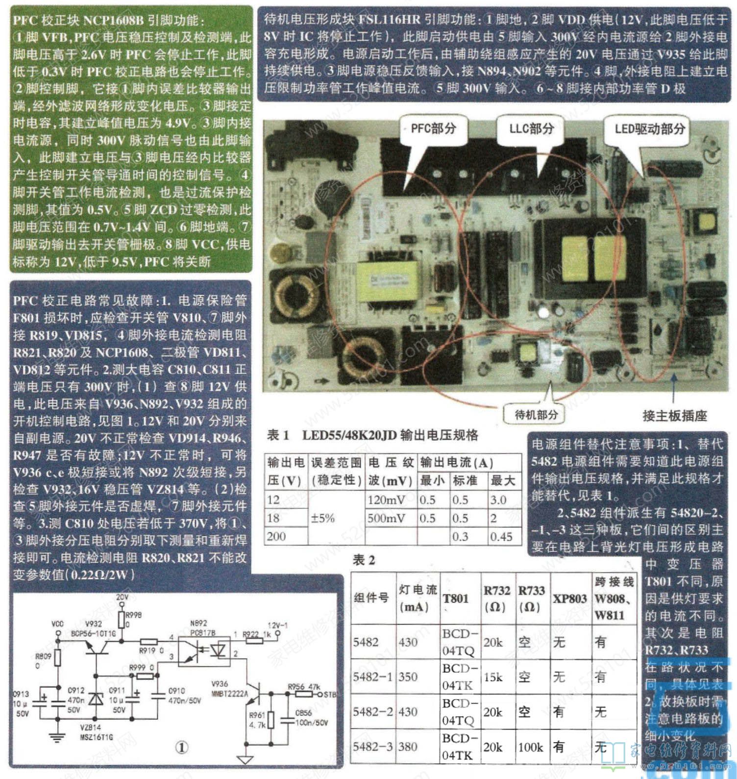 1.PFC校正电路,由NCP1608、升压电感L810、二极管VD811、VD812、大电容C811、C810、功率管开关管V810等组成。