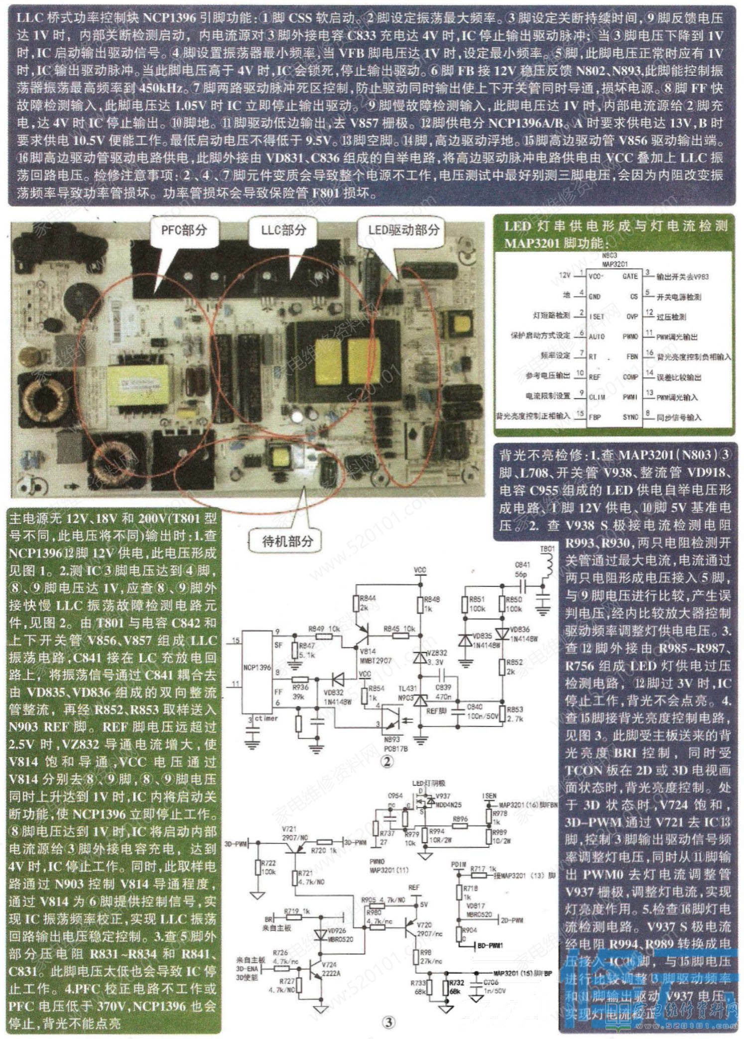 3.LLC主电源电路,由NCP1396、V856. ,V857和T801、C844组成,在T801次级整流滤波产生三路电压,一路200V ,供LED灯驱动电路,另两路分别是12V和18V供主板电路工作。