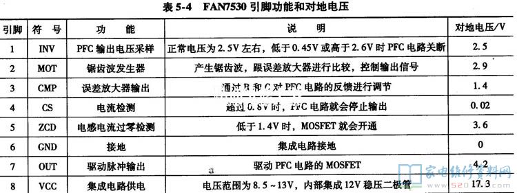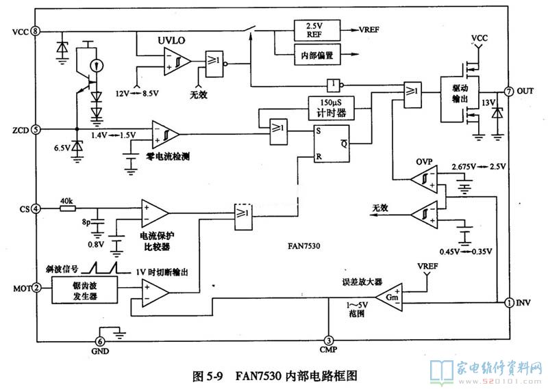 FAN7530是仙童公司开发的主动性PFC专用集成电路,其内部电路框图如图5-9所示,内含锯齿波发生器、误差放大器、电流保护比较器、零电流检测电 路、驱动输出电路等。芯片内部提供了多种保护功能,器件中的误差放大器和乘法器的内部门限可在电路出现过载时阻断输出,以进行限流操作,同时也可以防止负 载突然断开造成危害,由于这种输出驱动限制电路限制了开关管门极驱动电路在电源电压重点处的过载,因而大大提高了整个电路的可靠性。该芯片的工作频率是变 化的,本电源设定的最低工作频率是27kHz。FAN7530引脚功能和对地电压见表5-4。