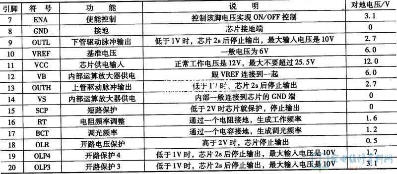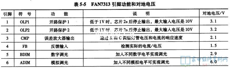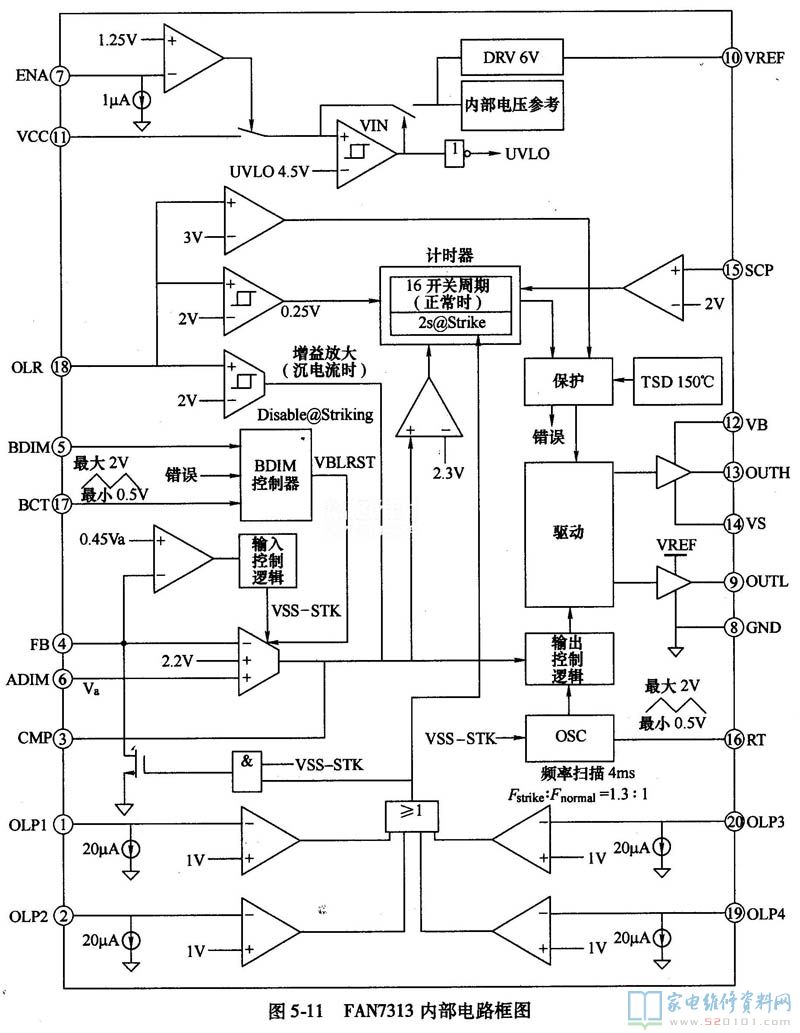 高压板振荡与控制电路由N803 (FAN7313)内外部电路构成,采用单12V供电,向激励电路输出两路驱动脉冲信号,并具有过电压、过电流保护功能。FAN7313是飞兆公司开发的 高压板振荡与控制专用集成电路,内部电路框图如图5-11所示,内含振荡电路、BDIM控制器、计时器、参考电压电路、频率扫描电路、输入逻辑控制电路、 输出逻辑控制电路、驱动输出电路等。FAN7313引脚功能和对地电压见表5-5。