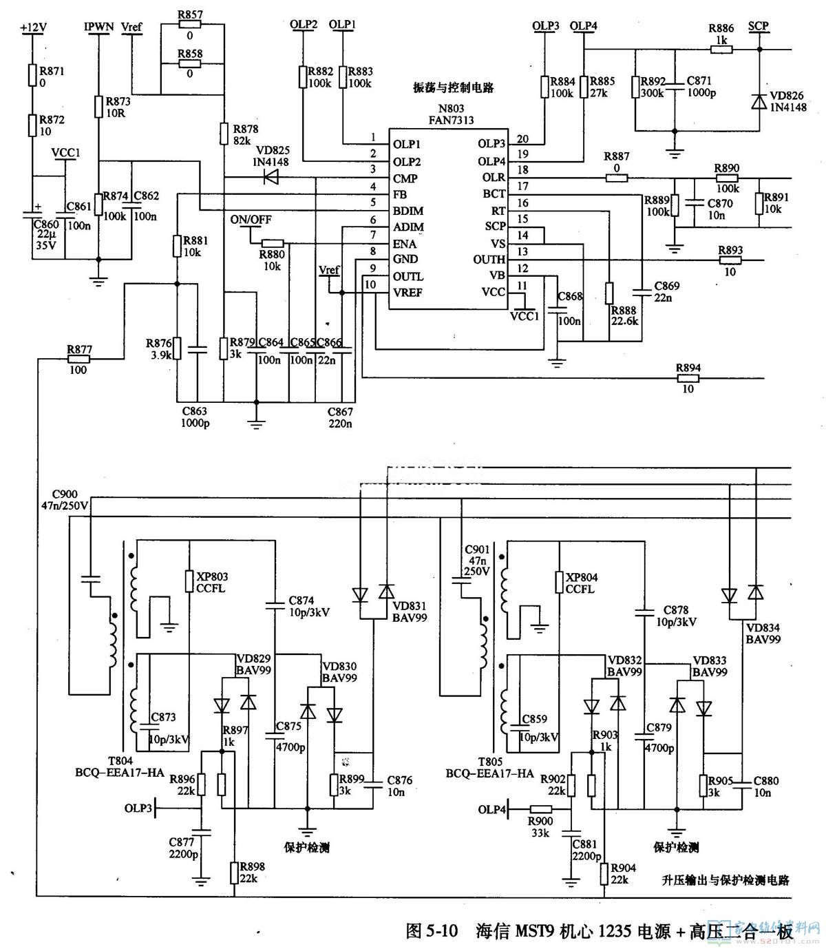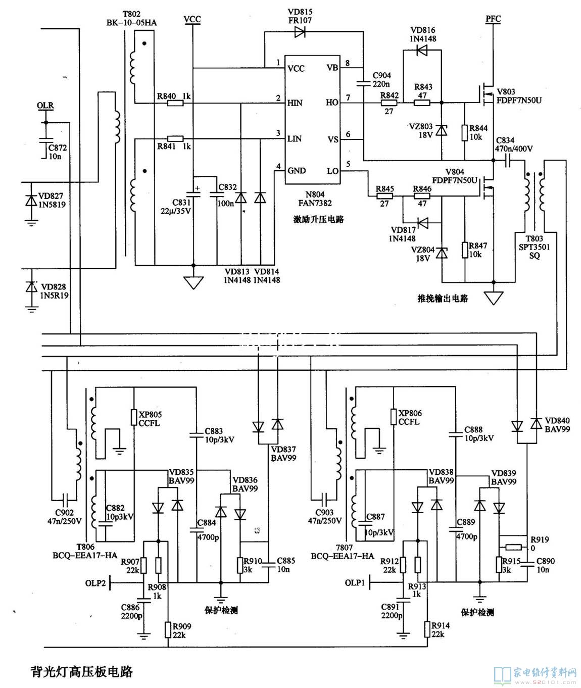 0888、C889对灯管的输出交流电压进行分压,C889上端分得的电压经VD839整流,在C890两端形成检顺组电压,经VD840将检测电压 OLR和SCP送到N803的18、19脚,同理T804 ~T806形成的OLR和SO检很组电压也送到N803的18、19脚,作为过电压保护检测的依据。当T804~T807的输出电压升高,经检测后使18 脚电压升高到2V以上时,N803停止工作。