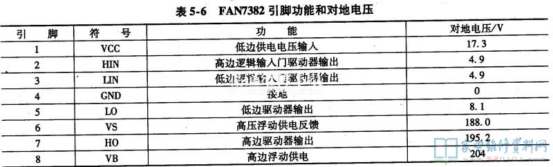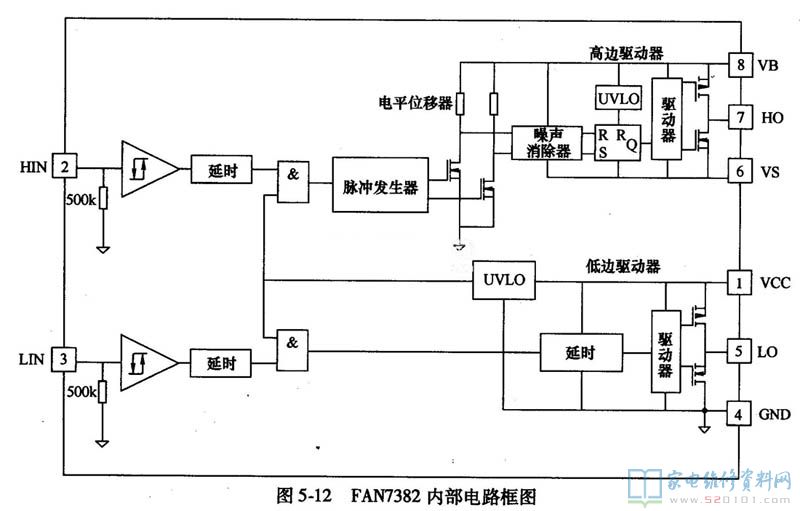 FAN7382是一款高边和低边门驱动单片集成电路,能够驱动工作电压达到+600V的MOSFET和绝缘栅双极型晶体管(IGBT)。 FAN7382采用两种供电电压,其内部电路框图如图5-12所示;引脚功能和对地电压见表5-6。