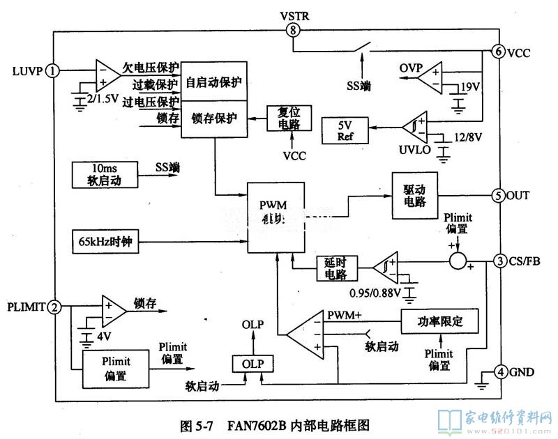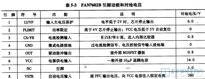 振荡与控制电路N801采用的FAN7602B是飞兆公司开发生产的专用于反激PWM的控制器,是一款绿色电流模式PWM控制器,内部电路框图如图5-7 所示,内设振荡器、误差放大电路、驱动输出电路,具有欠电压保护、过电流保护功能。FAN7602B引脚功能和对地电压见表5-3。