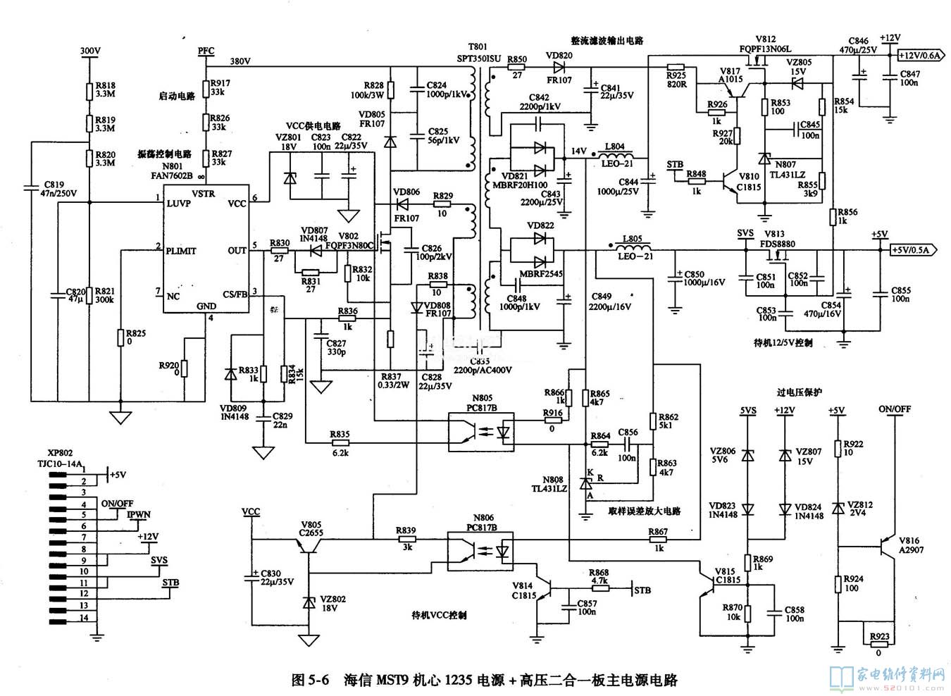 海信MS79机芯1235电源+高压二合一板主电源电路如图5-6所示。它由振荡与控制电路N801、大功率MOSFET(开关清)V802、开关变压器 T801、取样误差放大电路N808、光耦合器N805等组成。主电源产生5V-S、 5V-M、 12V、 14V四种电压,其中5V-S经开关管V813控制和降压取得5 V-M电压,待机时V813截止,降低待机功耗;14V电压经开关管V812与N807构成的稳压电路输出12V,待机时V812截止,以降低待机功耗。