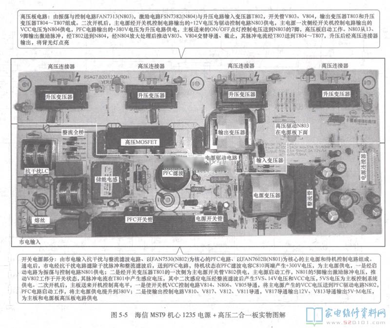 海信MST9机芯1235电源+高压二合一板的实物图解如下图5-5所示,其中电源部分由PFC电路和主电源电路两部分组成。电源板的输入电压范围为交流90~264V,最大输出功率为110W,电源额定输出功率为80W。