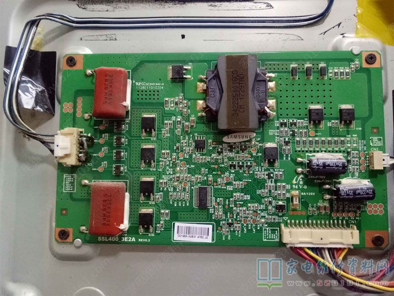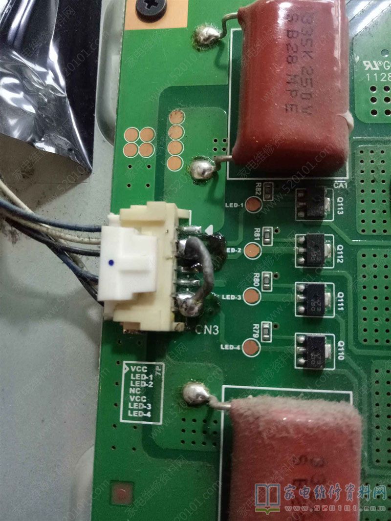 最近接修一台海信LED40K16X3D液晶电视,灯条只有个别灯珠亮起,恒流板竟然没有保护,控制芯片是:SSL100SN,在网上没有找到此芯片的去保护方法,今天发上来大家参考下,去保护的方法是在输出端(插口CN3)将LED-1、2、3、4短接在一起,如下图所示即可。