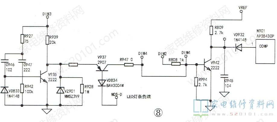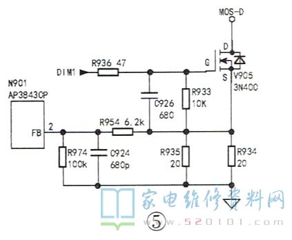 该电路由VD834、V937、VZ901、V935组成,如图8所示。在灯条正常工作时,MOS-D端电压为4.6V,VD834不导通,V937截止,DIM4为低电平,V942不导通,对N901的①脚电压无影响。当灯条开路时,MOS-D该点电压为oV,VD834导通,V937的e极电压为稳定的3.9V,此时V937导通,DIM4为高电平,V942、VD932导通,N901的①脚电压被拉低到0.7V,N901停止振荡。V935.R939 R927、C946、C947、VD833.R942组成延时电路。开机瞬间,DIM3先通过R927对C946、C947充电,在电容未充满电之前,V935导通,把V937的e极电压短路到地,V937截止;当两电容充满电后, V935截止,V937、VD834恢复正常工作。设计延时电路的目的是为了防止开机瞬间,在灯条供电还未完全建立时,因MOS-D端电压过低引起V937导通而误保护。