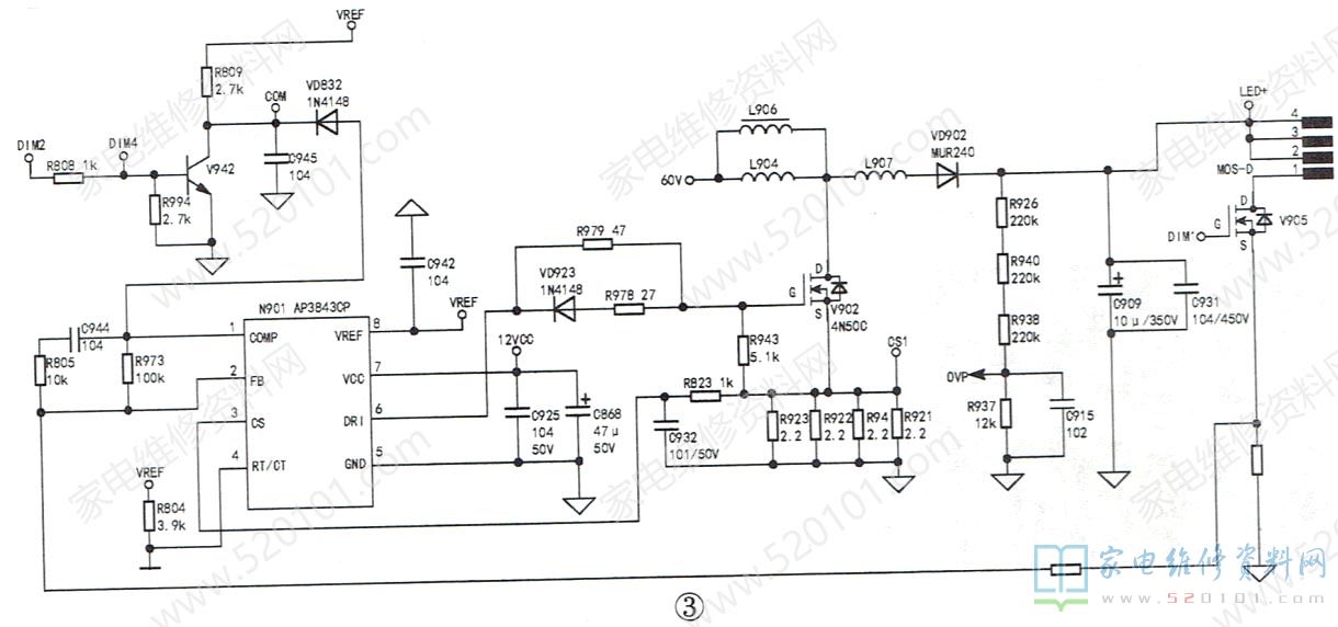 该电路主要由N901、L906、L904、V902组成。主板送来的4.2V高电平背光控制信号SW,通过R983和R999分压后加到V931的b极,V931和V932相继导通,12V通过V932的e、c极为N901的⑦脚供电。这时N901⑧脚产生5V基准电压,同时DIM2信号为低电平, V942截止,N901的①脚电压保持为2.4V,芯片工作状态不受影响。只要N901①脚电压不被拉低,②~④脚外围电路正常,⑥脚便输出驱动信号,使V902工作在开关状态。当⑥脚输出正脉冲时,V902导通,在L904和L906上产生左+右-的自感电势;当⑥脚输出负脉冲时,v902截止,L904、L906的自感电势反向,与60V电压叠加后输出145V电压(LED+),为灯条供电。相关电路见图3。
