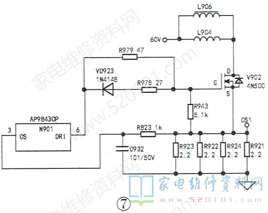 该电路主要由V902.R921 ~R924、R823和N901的③脚组成,如图7所示。若流过V902的D.S极电流过大,R921~R924两端的压降增大,即N901的③脚电压增大,当该脚电压超过1V时,N901停止振荡,进入过流保护状态。