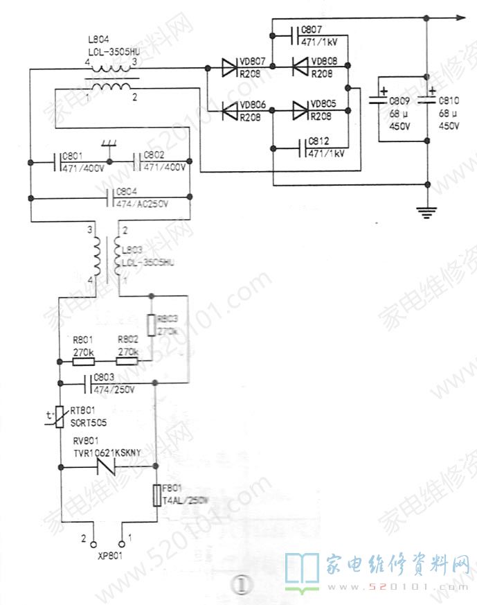 L803、L804是共模电感,C801、C802是共模电容,C803、C804是差模电容,R801~R803是关机泄放电阻,关机时泄放C803、C804中储存的电荷。上述元件组成交流输入抗干扰电路,作用是防止电网干扰影响电视机正常工作,同时也防止电视机产生的干扰信号窜入电网,对电网造成干扰。压敏电阻RV801用来防止市电过高或者雷击烧坏后级电路,RT801是负温度系数热敏电阻,用于限制开机浪涌电流。