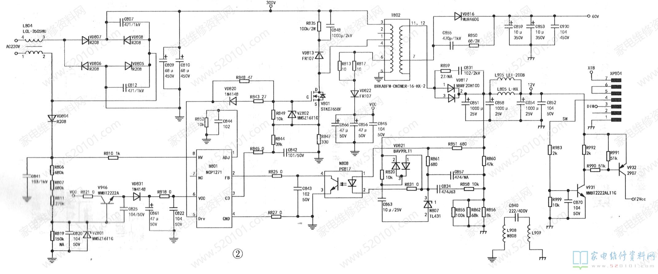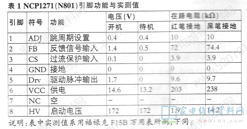 海信RSAG7.820.4555型电源板集电源与背光恒流驱动电路于一体,主要用于海信LED32H310、LED32K01Z、LED32K200、LED32K300等32英寸LED电视机中。现对该电路工作原理作简要介绍。下电源电路该电源芯片型号为NCP1271(N801),这是一块定频电流型反激变换式PWM控制器,可提供65kHz和100kHz两种开关频率,待机功耗低至100mW,其引脚功能与实测数据见表1。