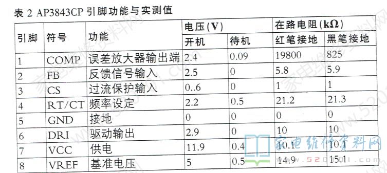 该部分电路主要由LED升压电路、亮度控制电路、恒流控制和灯条保护电路组成,其控制芯片采用AP3843CP(N901)。该芯片的引脚功能与实测值见表2。