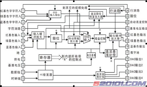 LM1269 为一块110MHz 适合I2C总线控制的RGB 视频放大系统。它所有的参数可由I2C总线控制,并具有110MHz 带宽的前级放大器,它的输出分交流的R、G、B与直流DAC输出,交流的R、G、B输出只是三基色的交流成份,直流成份则为DAC输出,其中前三路DAC 的输出为cut-off 的控制,同时作为整机的亮度控制,第四路DAC 能被设定成改变前三路DAC 的输出,也用作亮度调整,并这四路DAC全部可由I2C总线调整。在我们的维修中,若直流DAC 输出电路出现故障刚会造成只有色度信号,而没有亮度显示在屏幕上,会造成整机的画面很暗。整机的亮度、对比度可在此IC得到精密的控制。LM1269 的内部框图见下: