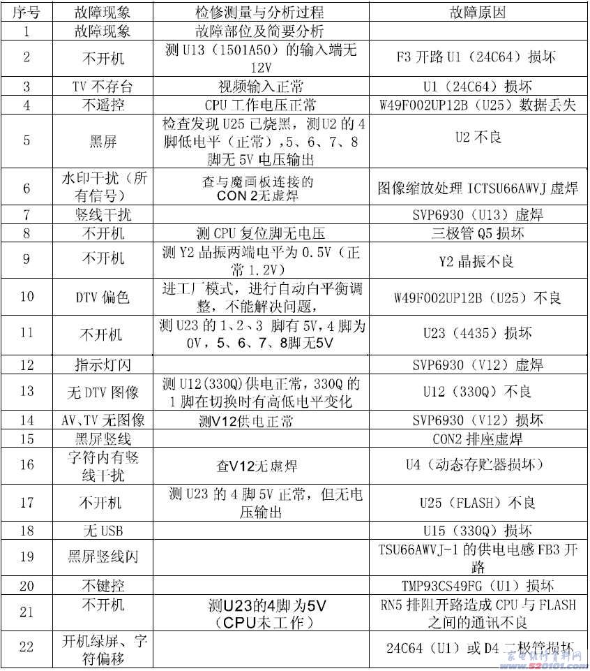 创维8TT9机芯故障速查一览表 2013-06-25 19:37:48 阅读 476 次 评论 0 条 版权声明:本文为转载文章,版权归原作者所有,欢迎分享本文,转载请保留出处! 点赞 分享: PREVIOUS:创维15LBATX/8TT6机芯故障速查表 NEXT:创维6P28/6P29机芯有时断音,有时开机无音的技改 文章导航