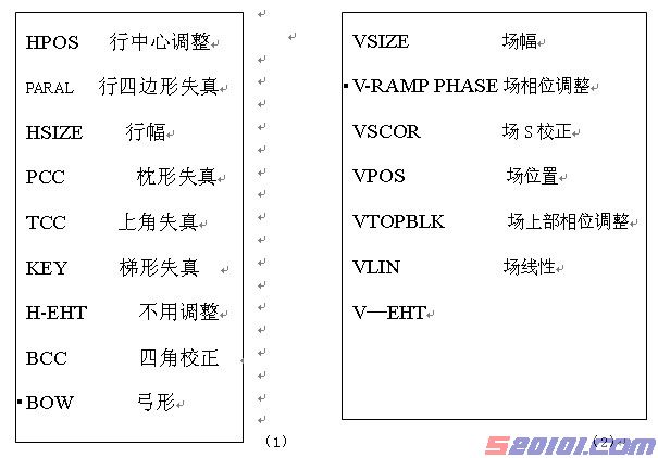 在工厂模式下,进入几何失真调整菜单,可在PAL制状态下,按60HZ、75HZ、100Hz三种扫描方式依次序分别进行平行四边行,帧中心,帧幅,行中心,行幅,梯形失真,上、下角失真,枕行失真等调整。