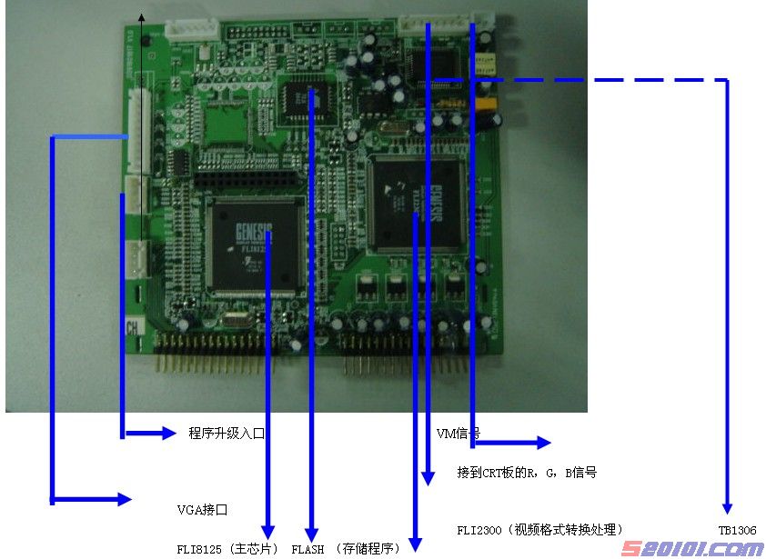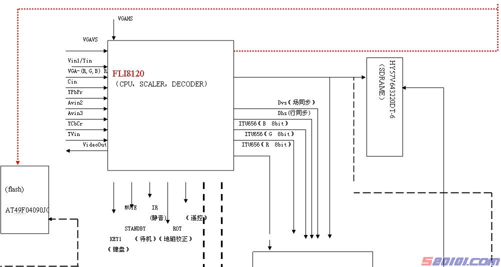 FL8120是美国GENESIS公司最新研发的集成嵌入式微处理器(MCU),三路ADC转换通道,2D视频解码,SCALER运算处理于一体的视频信号处理芯片。它具有图象边缘自修正,自适应彩色,对比度调整等等强大的功能,输入的TV全电视信号;Y、CR、CB分量输入信号; Y、C输入信号;视频1;视频2。进入FLI8125的视频信号通过ADC通道转化为数字化的视频信号,并同时分离出行,场同步信号。视频信号经过解码模块进行数字解码,再把经过解码的信号进行运算处理后输出 24bit BTU656信号( R,G,B)输出。另外此集成电路包含的ROM,RAM接口可通过总线传输的信息对外部32位 SDRAM进行存取数据的操作同时按照FLASH里的程序来执行指令完成的整机的各项工作。同时此集成电路含有KEY,IR,MUTE,STANDBY等控制信号可方便的对机器进行操作控制。