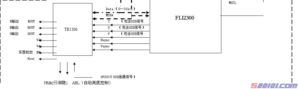 视频信号通过9脚(TV-VIDEO)输入给数字板。同时从AV1,AV2输入的视频信号,及从USB模块解码出的Y,C分离的视频信号和S端子输入的信号可同时进入FLI8120(集成电路U201)通过集成在其内部的MCU控制,在其内部进行选通后分别进行视频解码,经过数字解码后的图象信息送给图象处理模块进行黑电平延伸,梳状滤波,彩色提升等图象效果处理后输出ITU656格式的数字信号给FLI2300(集成电路U301);从YPbPr、RGB输入的HDTV信号经FLI8125 A/D转换后然后再进行图象处理后也输出ITU656格式的数字信号给FLI2300;FLI2300对数字信号进行倍频(行,场频)、增减处理后,形成的图象信息在其内部进行D/A转换后从FLI2300的170,173,176脚输出Y、U、V信号。FLI2300输出的Y、U、V(已包含有OSD信息)信号在经过TB1306(集成电路U401)放大处理后输出给CRT板上视放块TDA6111Q。