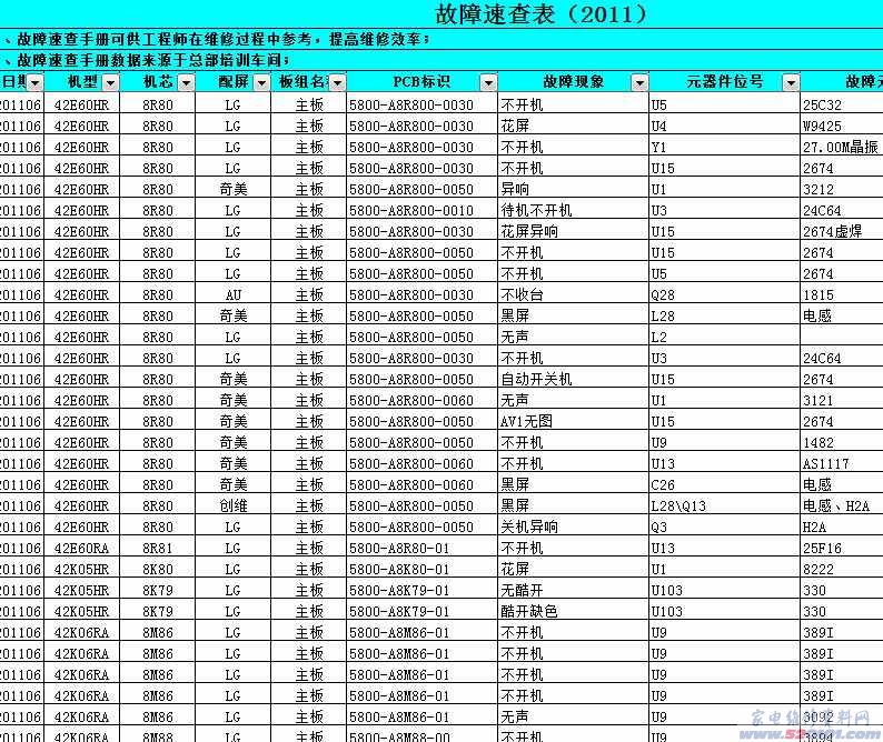 创维液晶电视故障速查表(官方资料) 2013-07-21 04:35:03 阅读 258 次 评论 0 条 摘要: 此维修EXCEL表格是创维公司培训车间精心整理制作而成,能很快速查到某型号。截止日期是2011年6月之前的机型。故障案例1101条。预览图:点击下载:创维液晶电视故障速查表 此维修EXCEL表格是创维公司培训车间精心整理制作而成,能很快速查到某型号。截止日期是2011年6月之前的机型。故障案例1101条。 预览图: 点击下载: 创维液晶电视故障速查表 版权声明:本文为转载文章,版权归原作者所有,欢迎分享本文,转载请保留出处! 点赞 分享: PREVIOUS:TCL液晶电视如何检查是否屏裂? NEXT:TCL L32F2360液晶电视(MS82机芯)能开机,黑屏(背光不亮) 文章导航