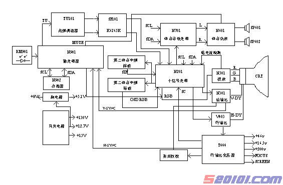 - 小信号处理部分:由超级单片集成电路N201(TDA8843)等组成;