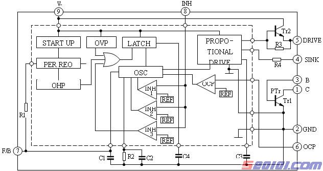 STR-S6709⑧脚是截止同步及门闩电路控制信号输入端。它内部有三个比较放大器。其中比较放大器INH-1、比较放大器INH-2的输出控制振荡电路,比较放大器INH-3的输出控制门闩电路。它的作用: