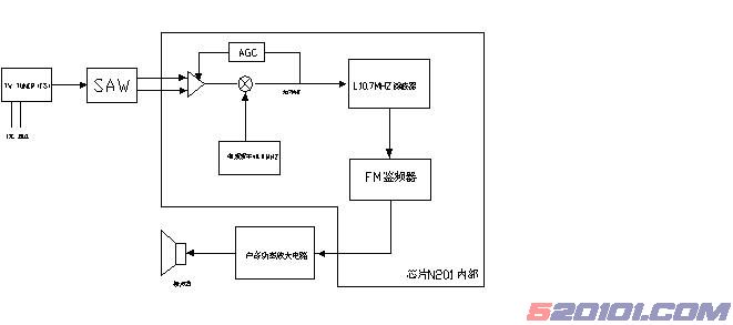 芯片N201有两个音频信号输入脚,因此该机芯可以做AV立体声功能;