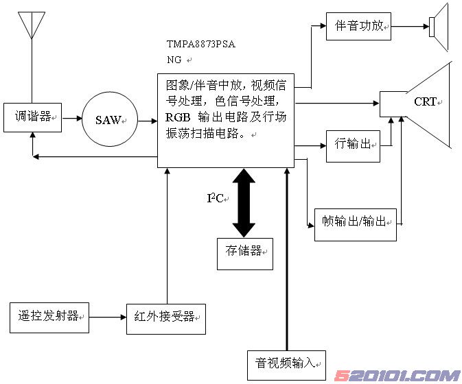 该芯片可完成图像中放、图像检波、伴音中放、伴音鉴频、视频放大、色度解码、行场同步扫描波形的生成和输出以及FM收音机等功能。图像检波、伴音鉴频、色度解码等电路都采用了PLL锁相环解调,稳定性和可靠性都大大提高。此外,该芯片还将庞大的亮度延迟线、色度基带延迟线集成到芯片内部,增加了黑电平延伸、总线几何图形调整、I2C总线控制等功能,从而实现整机无调试点,调整点和外围元件减至最少,而图像质量大大提高;原来的高频头和声表不变,在IIC总线的控制下,高频头在88MHZ-107MHZ的频率范围内进行搜台并把搜到的FM信号放在37.3MHZ上,中频信号在进入芯片后,通过与内部48MHZ的本振频率混频后得到10.7MHZ的第二伴音中频信号,该信号在31脚输出后经过外部的L10.7M滤波器后在芯片33脚输入,然后经过芯片内部的10.7MHZ鉴频器把声音信号解调出来。