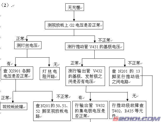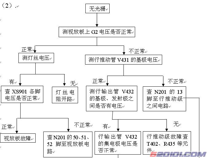 按下调试遥控器上的 键或用户遥控器的-/--键。此时屏幕上出现一条水平亮线,随后调节行输出变压器上的帘栅极(G2)电位器,使屏幕上的水平亮线刚好看得出。如果此时出现的是一条红色的水平亮线,则红色“+”键不动,按动蓝色的“+”键,直至该水平亮线成为紫色。假如按过头则可按蓝色“-”键,直到水平亮线呈紫色为止。接下来按动绿色“+”键,使水平亮线变为白色。假如按过头则可按绿色“-”键,直到水平亮线呈白色为止。最后按 键或-/--,恢复光栅。