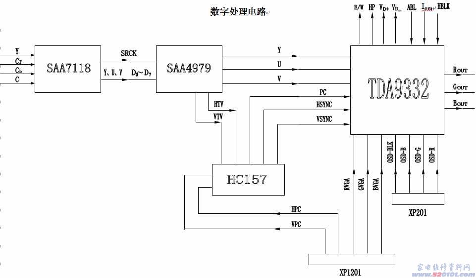 TDA9332是总线控制的显示处理器。SAA4979(54)、(55)输出的行场同步经HC157电子开关与VGA输入的行场同步完成切换后送入TDA9332的(23)与(24)脚经行场同步处理后分别从(8)输出HD行驱动信号。从(1)、(2)输出场驱动信号。从(3)输出枕校信号。