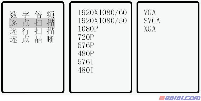 - 按下此键,OSD将分TV、HDTV、VGA三栏显示本机支持的扫描模式列表,并突出显示当前输入信号的扫描模式项;