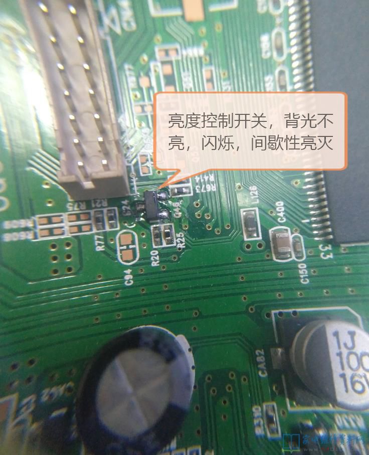 先解决背光问题再去搞声音,测量各电压正常,背光控制芯片用的是BD9262FP,在R12并10K电阻能点亮灯条,认为是灯条的问题,查了一下这灯条是一体侧入的比较贵,报红黑棕,用户竟然同意修。下单等了几天才收到,收到货后装机开机马上亮了,试机了三个多小时又开始出现黑屏,关机再开机又好等一会又闪烁。瞬间傻眼了,又一样的故障,看来灯条白买咯。开机等背光闪烁出现故障的时候测灯条的开关电压5V始终正常,只有亮度控制脚ADJ有在1.2V,明显不正常,顺着主板ADJ跑到贴片Q46(标1E),在路测居然没动静,拆下测量还是没动静,Q46果然有问题,找了个贴片8050换上,ADJ回到3.2V,试机半天不在闪烁黑屏。