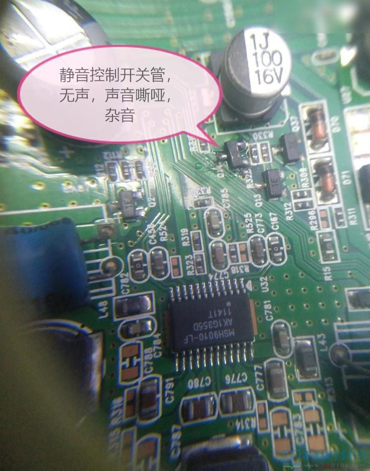 回到声音问题,起初也以为是喇叭的问题,换喇叭后故障依旧,又回到主板,功放用的MSH9010-LF,查5脚是静音脚,出现故障时候只有0点几V,顺着5脚往外查到贴片Q14(标1E)静音控制管,测量也是不通,果断换上了一个,5脚电压回到5V,声音正常。试机三天后一直不在出现故障,故障排除。