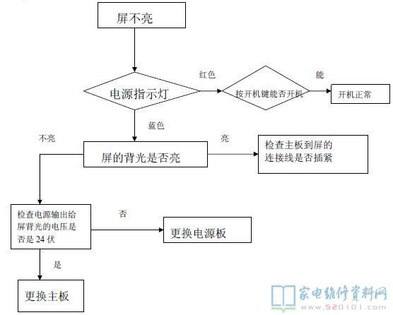前言:本文整理的维修框图仅限于板级维修和初步排查,简单的讲述了屏不亮,不通电,无声音,无图像等常见的故障,仅供广大维修网友参考。