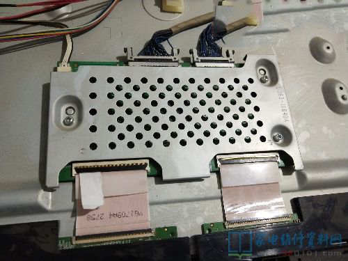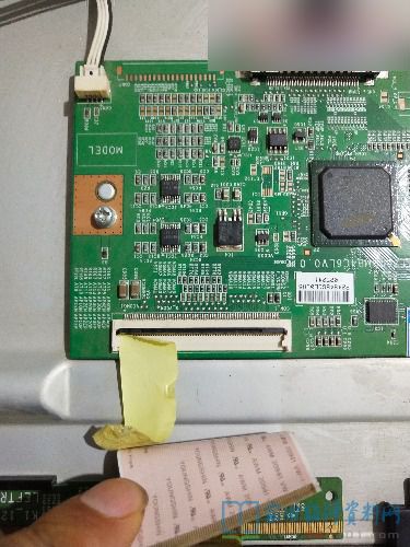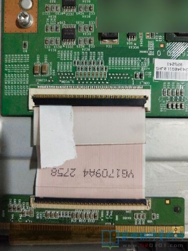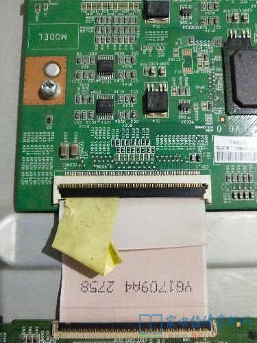 想起来前几天在网上有看到过有切断屏供电的方法修复坏屏,决定试试。开始用胶带绝缘右屏与逻辑板的供电,但不知道哪个脚是供电脚,就不停的移动绝缘位置,当移动到如图的位置时,开机屏幕图像基本满屏,但右边有一寸宽的垂直黑带,改用窄点的白纸绝缘此处,黑带消失,美中不足是右屏比左屏暗,电话联系客户,告知修复结果,表示很满意,起码不用掏几千块钱买新电视了。