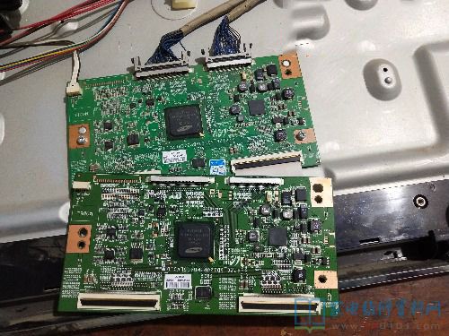 接一台海尔LE43A700K液晶电视,故障现象:开机显示海尔logo后灰屏,屏幕有垂直竖带,声音正常。初步怀疑逻辑板问题,刚好手头有一块同型号(K726-SD120PBMB4C6LV0.0)逻辑板,换之开机,故障依旧。估计是屏的问题,试着取掉右屏与逻辑板的排线,左屏图像正常,看来是右屏有问题。
