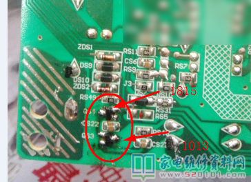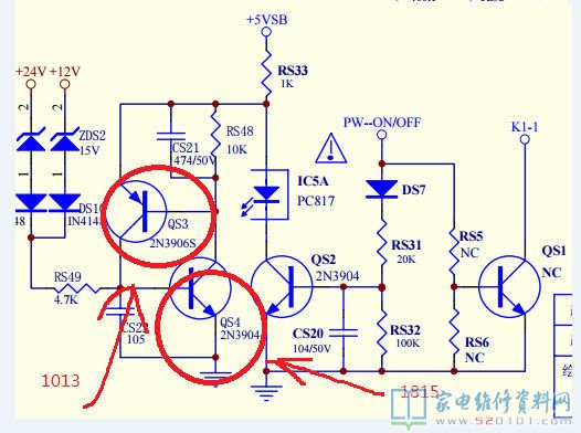 经检查(检查过程忽略)发现电源板两个贴片三极管QS3、QS4不良,丝印太小看不清,于是用A1013和C1815进行代换,换上去之后开机图音正常,机器修复。