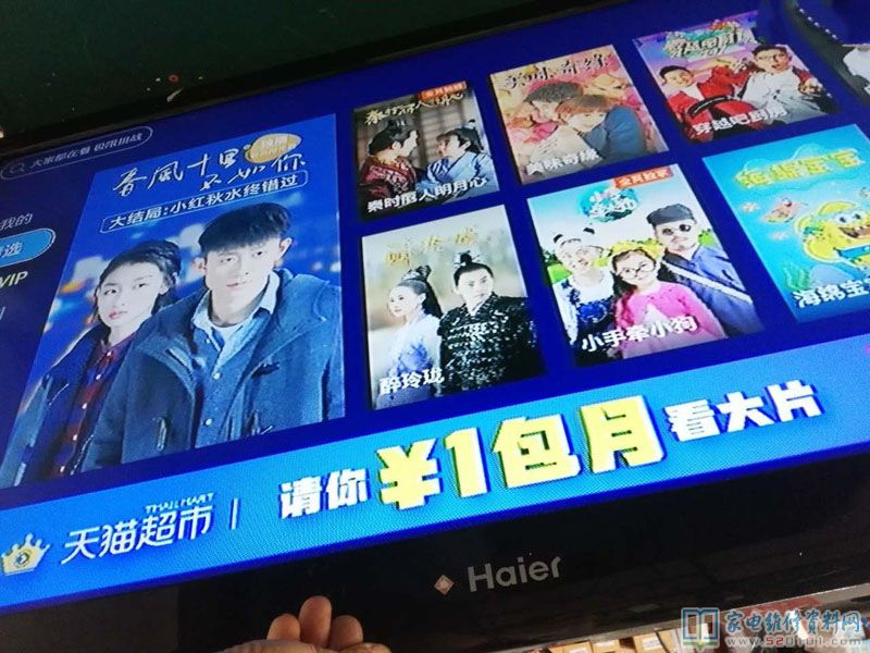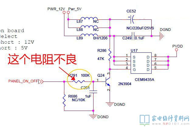 一台海尔液晶电视,型号是L42G1 ,故障表现为灰屏,液晶彩电灰屏故障比较多,引起灰屏的原因有屏本身也有主板原因,今天修到的这款机子就是由于主板引起的灰屏。开机背光亮后,首先测量上屏电压为0.46V 显然不正常。查找资料后发现屏电压是由 U17和 Q24控制的,U17就是一个场效应管,测量D极0.46V(也就是屏电压端),S极12.1V G极为12.0V 不正常,顺着检查Q24各脚电压,发现基极电压只有0.3V,而R291的另外一端有3.3V的开启电压,开关电视3.3V有高低变化而Q24的基极基本不变。说明这部分电路有故障,拆下R291测量,阻值远大于100K。由于这么小的贴片电阻找不到,就装了一个普通电阻,开机后测量Q24基极电压0.56V而场效应管的D极也有了正常12V屏电压 ,此时, 蓝屏出现,故障修复。