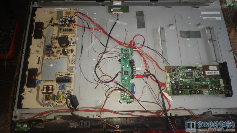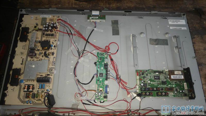 接修一台海尔L32B1彩电主板坏,因为原机主板价格太贵了,个人觉得不划算,决定用朗华万能板改,此液晶电视屏供电为12V,左供电,单8,确定这些参数后淘了一块板回来,并配好屏线,原主板去掉不用(但是为了美观和接视频信号方便,原主板仍然保留,只是拔掉所有插线),把电路稍作改动即可,因为此板没有开待机电路,所以把电源板5V待机电压和开机控制端用1K电阻连接强行开机。试机,屏幕花屏,进工厂模式把屏参稍作改动即可,具体请看下图。