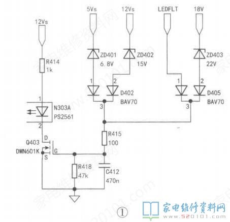 一台海尔LD55U9000型液晶彩电,指示灯不亮,不开机。该机采用电源背光二合一板,板号是R-HS205D-3SF81(长虹欣锐XK7.820.363V1.2)。在路测量,发现保险丝F101(T5A)已开路,说明后级电路短路。测量市电整流滤波电路,未见异常,转向检测PFC电路,发现开关管Q201(7N65)已短路,对应的推挽驱动三极管Q2O5SQ2O3的b-e结击穿。更换Q201、Q205和Q203后,在F101处串入白炽灯,单独给二合一板通电,测得开关电源次级输出12V和5V电压,PFC电压为360V,偏低。根据上述现象分析,其原因可能是二合一板没有接入LED灯条,导致电路保护。该机保护电路如图1所示。