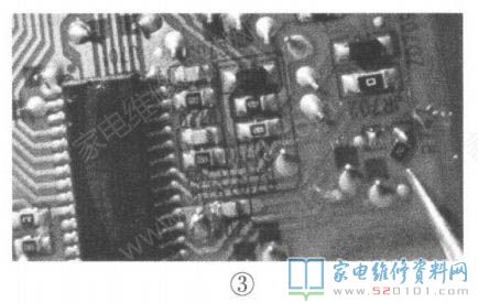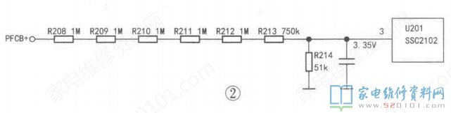 开机2min后,发现PFC开关管的散热片温度高达65ct(环境温度为27P),说明PFC电路仍有故障,结合PFC电压偏低这一现象,怀疑PFC电压取样电路(如图2所示)有问题°检查分压电阻R208〜R214,未见异常,难道是这些电阻下面的红色固定胶漏电?取下这几只电阻,清除红胶后再装回,通电试机,图像、声音均正常,此时测得PFC电压为395V。