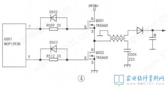 后来又遇到一台该型彩电三无故障机,在路检测,发现保险管F101开路,背光LLC谐振管Q501、Q502短路,相关电路如图4所示。根据经验,Q501、Q502损坏后一般会连带损坏其前级驱动芯片U501(NCP1393B)。更换F101、U501,用TA6160(或TN65)型管代换Q501、Q502后试机,故障排除。