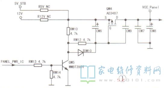 一台海尔LE40AL88D88A型液晶彩电,开机后灰屏,但伴音正常。上电,测得逻辑板上的12V供电为0V。该机上屏电压控制电路如图1所示,12V的一路电压通过电阻R12V接到QM4(P沟道场效应管)的S 极,另一路通过RM10加到三极管QM5的c极。二次开机后,CPU输出的PANEL信号为高电平,QM5饱和导通,其c电极输出低电平,QM4导通,其D极输出12V电压供给逻辑板。二次开机后,测得QM5 b极电压为0.67V, c极电压为11.63V;QM4 G极电压为11.63V,D极电压为0V。正常时QM5的c极电压应接近0V。怀疑QM5损坏,拆下检查,其b-c结开路。换上一只S8050型三极管后试机,故障排除。此时测得QM5b极电压为0.67V,c极电压为0.08V,QM4的D极电压为12V。