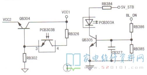 一台海尔LE43AL88U51型液晶彩电,二次开机后, ,开机音乐正常,但背光不亮,过一会儿自动关机。本机使用三合一主板,主芯片是MSD6A638。用LED灯珠测试仪测灯条,能正常点亮。本机背光供电由UB301 (LD5530R )组成的开关电源提供。开机,测得UB301⑤脚(VCC )电压始终为0V,明显异常。UB301⑤脚供电来自QB304,如图1所示。