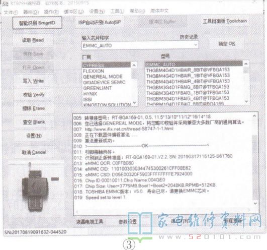 按此方法,再重复上面步骤约10s后背光亮,屏显“系统正在升级”,并出现升级进度条。升级完成后开机,声音、图像正常。用户称:该机一年内已升级几次,之前都是卡在开机画面,但不会自动关机。根据用户提供的信息分析,怀疑eMMC芯片有问题。拆下eMMC芯片检测,其结果如图3所示,需更换eMMC芯片。