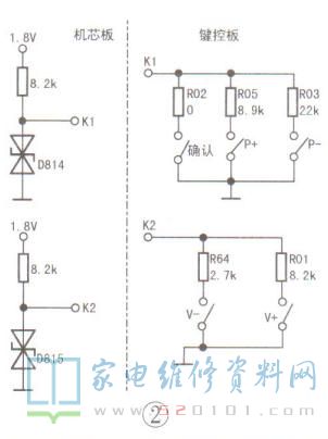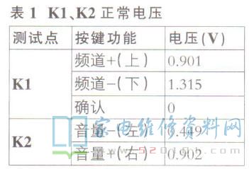 当闭合不同键时,因下拉电阻阻值不同,取出的电压不同,经CPU识别后发出对应的指令。该机K1、K2的正常电压见表1。
