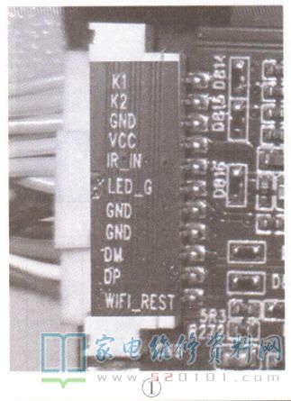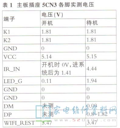 插座5CN3的①、②脚是本机按键输入端,③脚接地端,④脚是5VSB供电端,⑤脚是IR输出端,9、10脚是USB数据线,11脚是WIFL REST信号。二次开机时,遥控器发送开机指令,小板接收处理后,从IR端输出一个开机指令到主板,CPU收到指令后发出系统启动指令,系统启动后遥控器发出的所有信号都通过USB数据方式和CPU进行通讯。实测5CN3的各脚电压见表1,实物见图1。