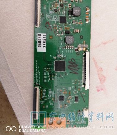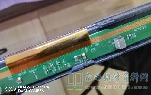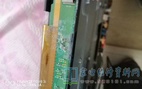 等走后我就把逻辑板保险,用1A的小保险管换上,心想就这点事,通电傻眼了。还是灰屏,12V过来了,测VGH--0V,VGL--负4.97V,VDD--0.067V,HADD--0.77V,芯片U11烫手,赶紧断电。心想这下糟糕了,真的屏坏了?看看是哪边的屏吧,当断开右侧屏线时,左屏显示有竖条,右屏白屏。测量VGH有27.9V电压,VDD有16.46V电。VGL还是负4.97V。又断开左屏线时,全屏灰屏。心想是右侧屏短路了。拆屏看看吧。小心翼翼的把屏条拆下来,露出屏边条,查看右侧屏边条。一眼看到有一处腐蚀了,可能是进水了。清洗好后露出4个电容。用表测量C143严重短路,C144和C141、C142还好。立马吹下更换,通电测量各供电一切正常,屏立马点亮,久违的海尔字符出现了,接通信号,图声俱佳,故障修复。